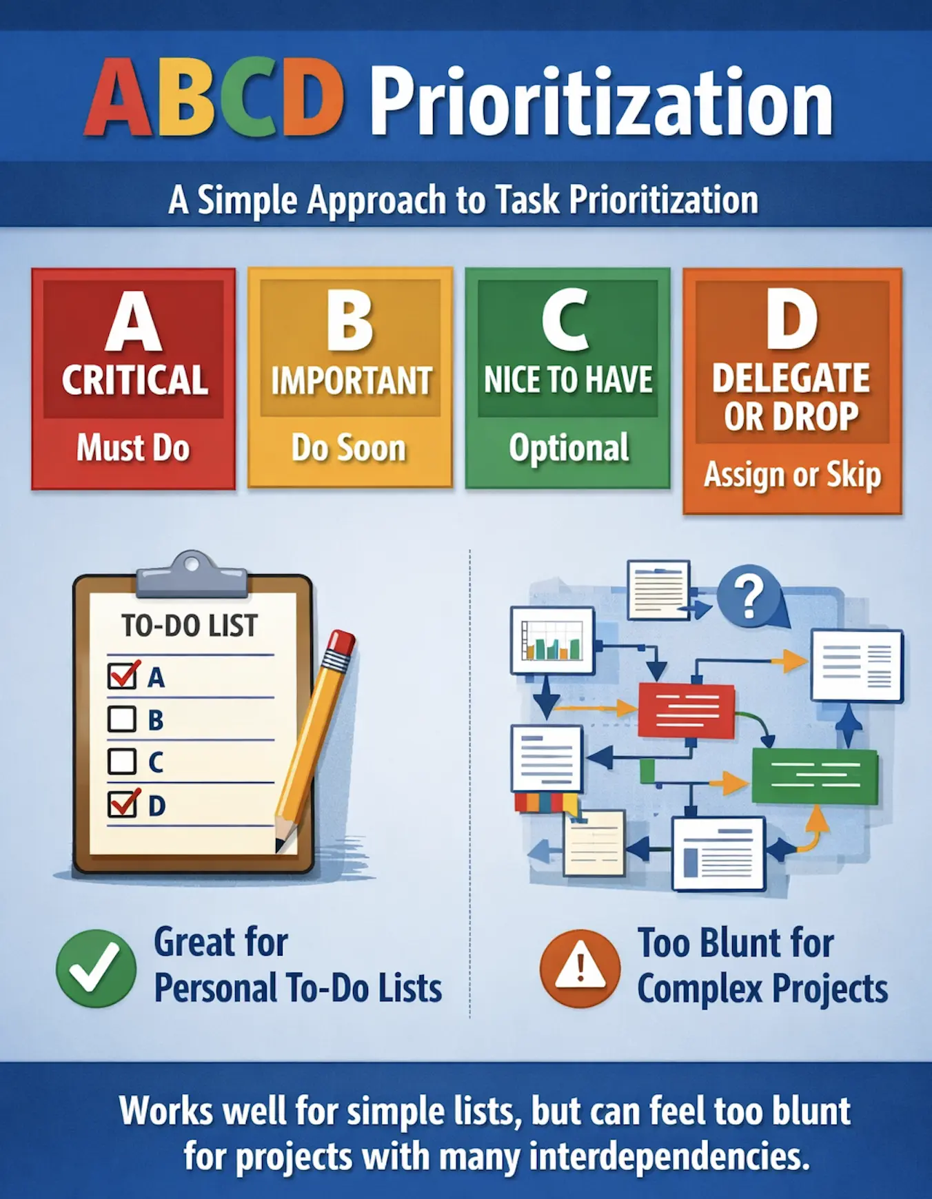 - ABCD prioritization is one of the simplest approaches. You label each task A (critical), B (important but not urgent), C (nice to have), or D (delegate or drop). It works well for individual to-do lists but can feel too blunt for complex projects with many interdependencies.