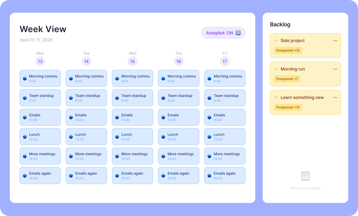 That's exactly what happens when you combine your backlog, your calendar, and AI-based planning in one place. Your routine gets structure. Your goals get space. And your day, for once, reflects what actually matters to you.