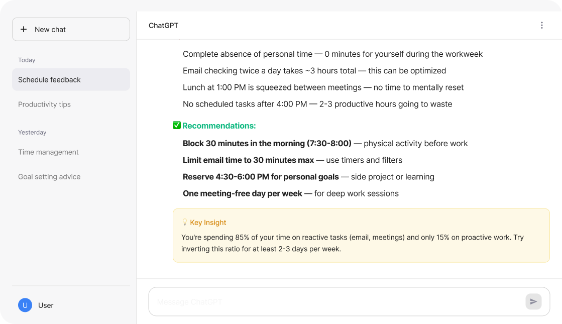 💡 Pro tip: Make this a weekly ritual. Every Sunday, ask ChatGPT for a short debrief of your previous week - what worked, what didn't, and what one habit to reinforce next week. Five minutes of reflection compounds just as powerfully as five minutes of planning.