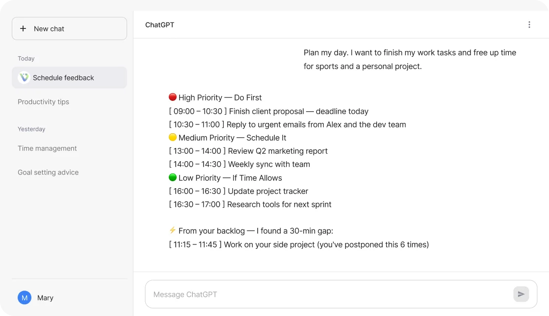 Ask ChatGPT to find a real slot in your day for something that moves you toward a bigger goal, not just what's urgent, but what's important.