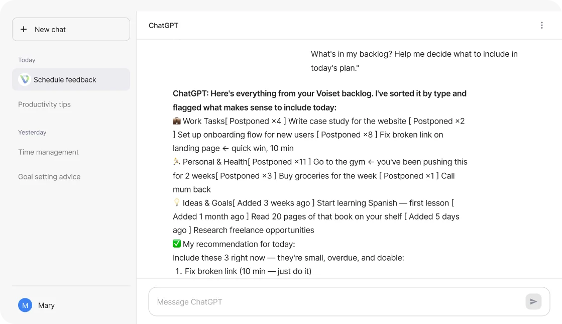 Ask ChatGPT to pull up everything sitting in your Voiset backlog - not just work tasks, but the gym visit you keep postponing, the book you wanted to start, the errand your mum asked about last week.