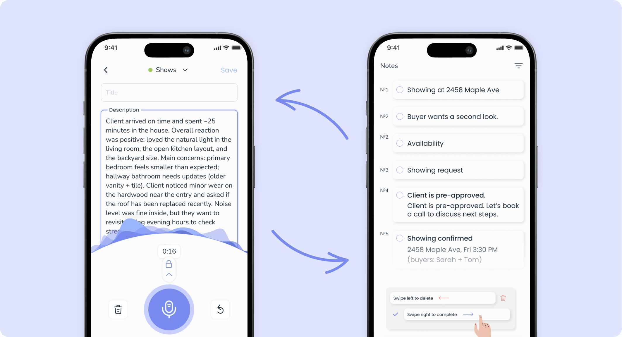 Capture next steps right after a call or showing while details are fresh.